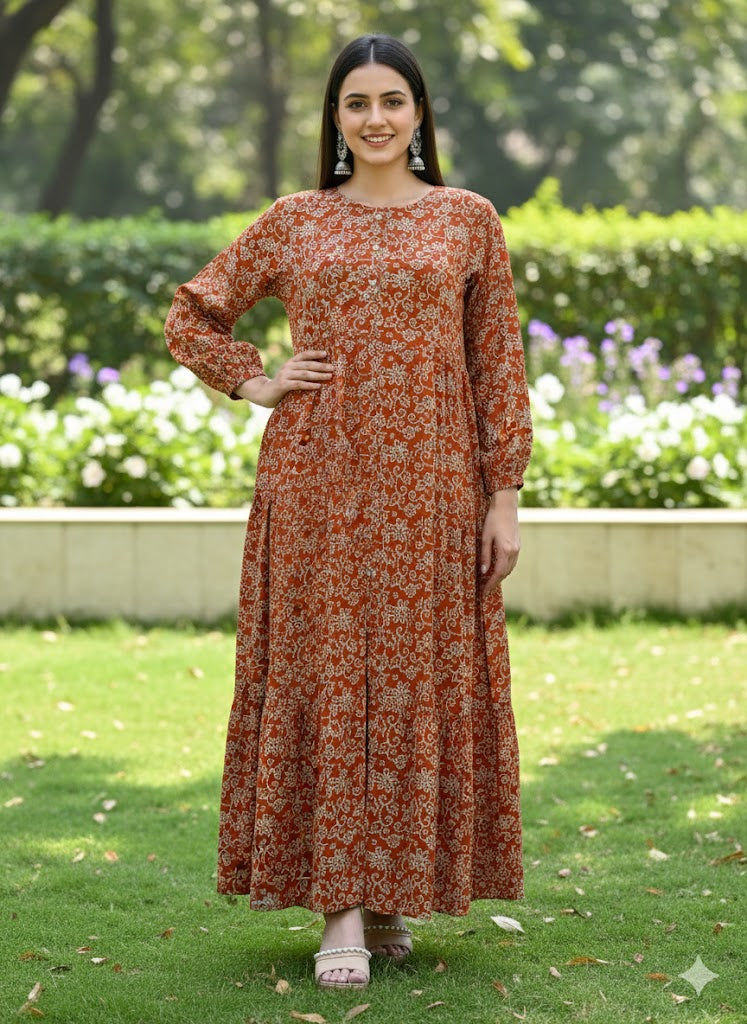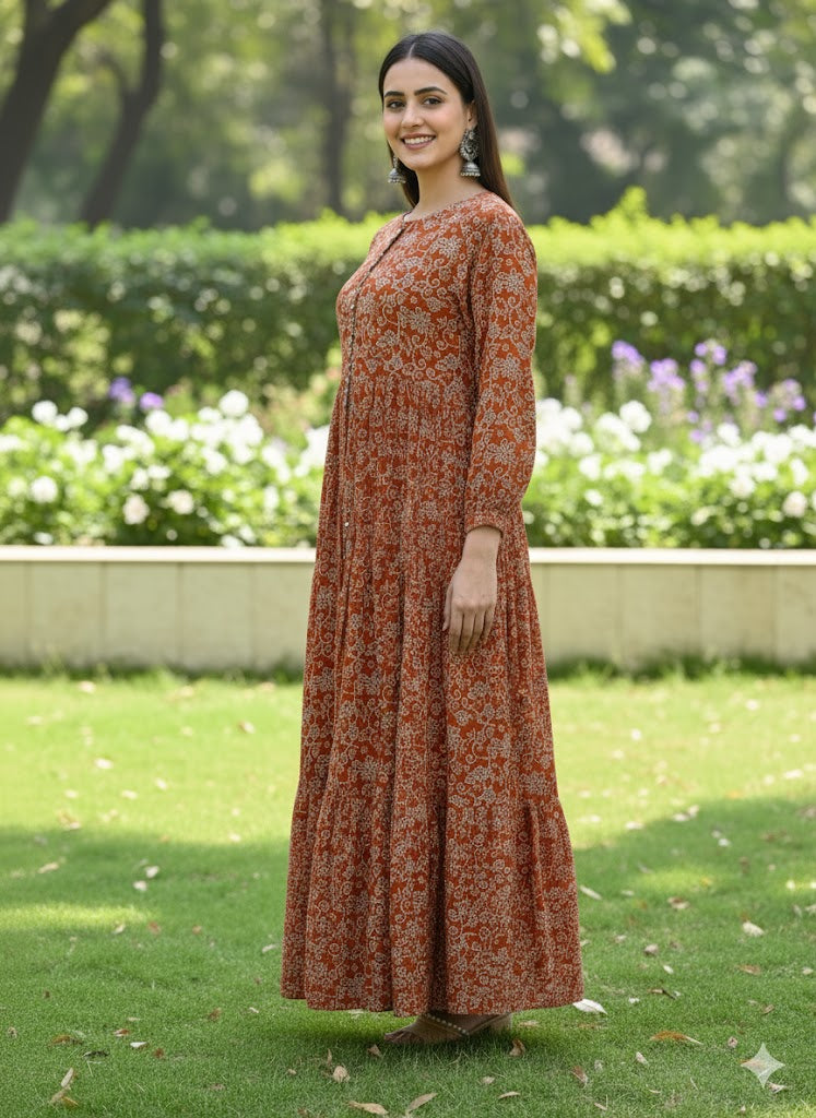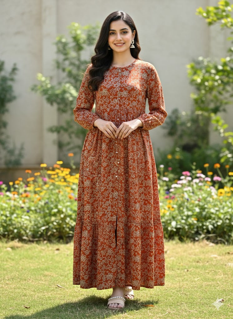 Embrace effortless style with this rust-colored long frock, designed for a timeless look. Featuring buttons along the entire front and elegant three-layer pleats on both sides, this outfit combines sophistication with comfort. Perfect for making a statement at any casual or formal gathering.