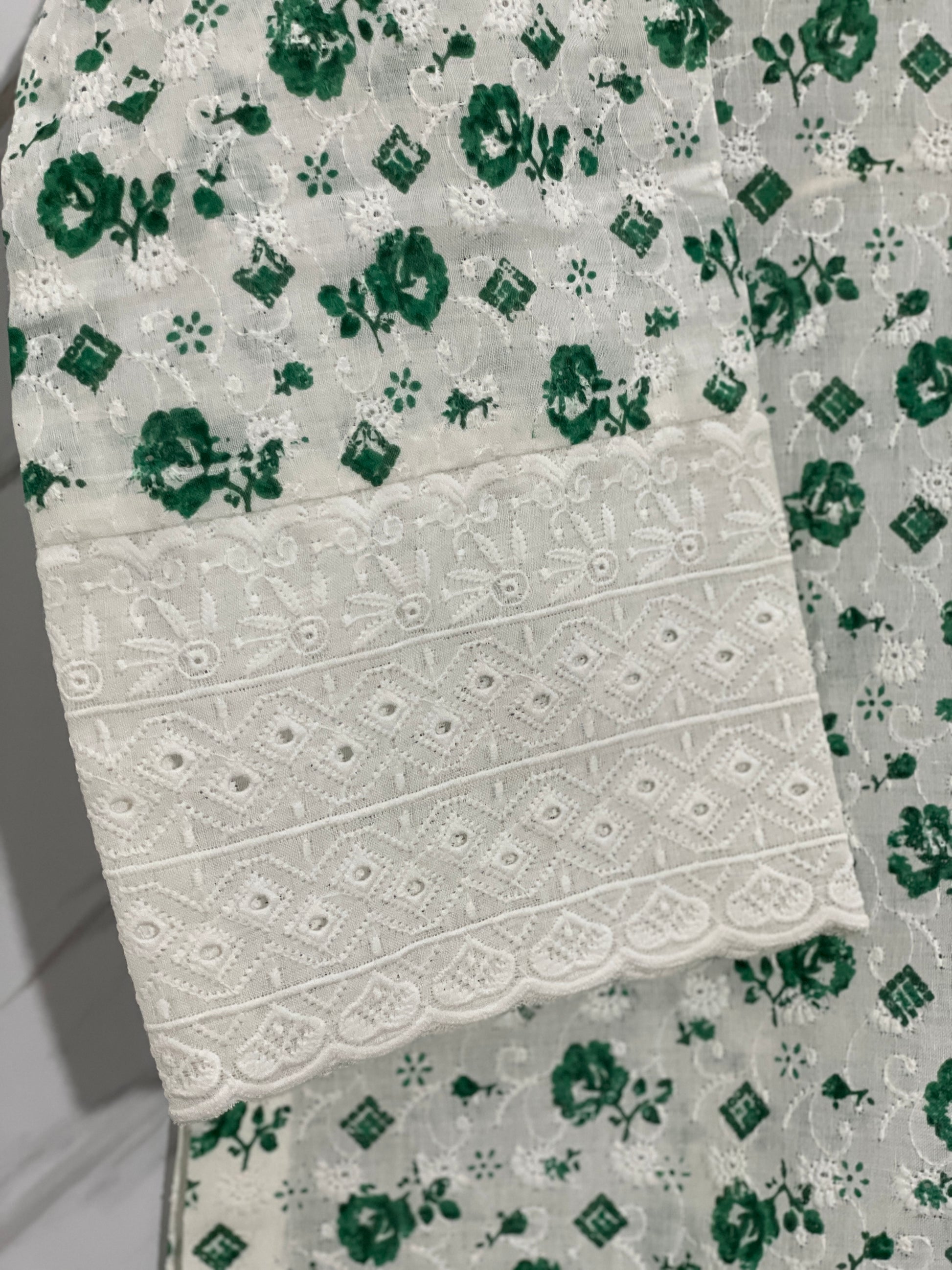 Fresh vibes with a fusion of white and green. Chikankari artistry meets delicate lace and embellishments on the neckline, with lace-adorned sleeves and a stunning front border to complete the look. Timeless elegance in every stitch! 💚💫