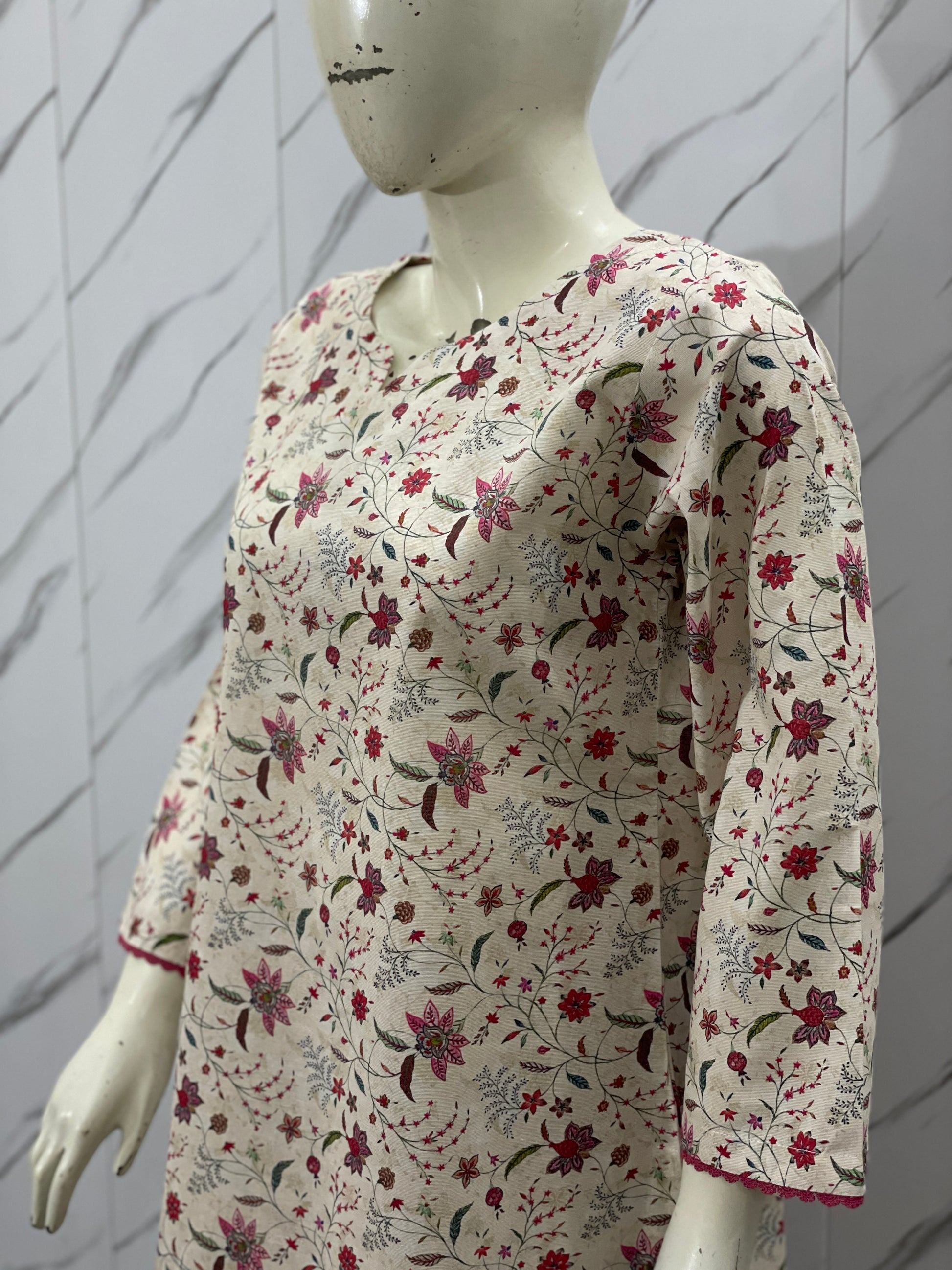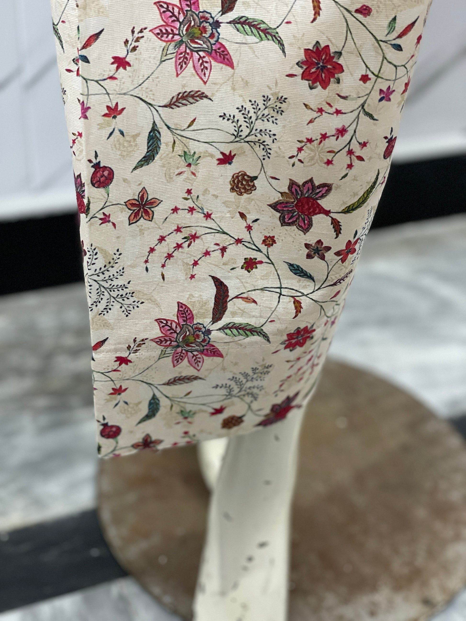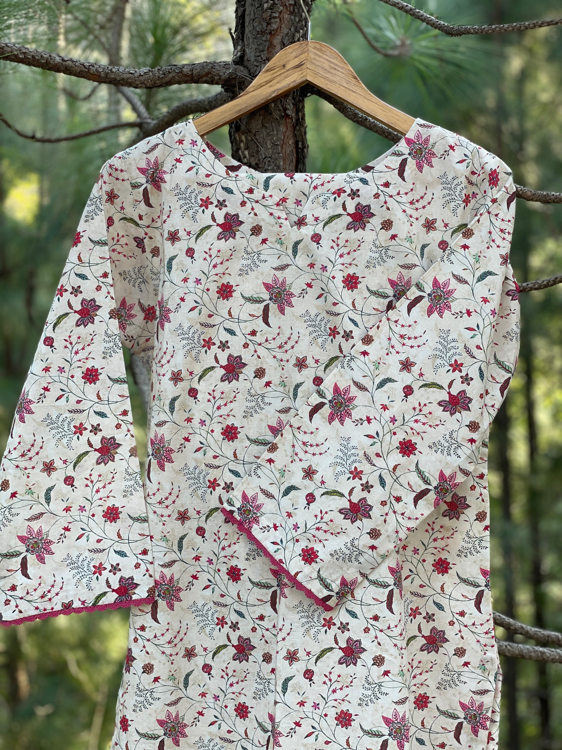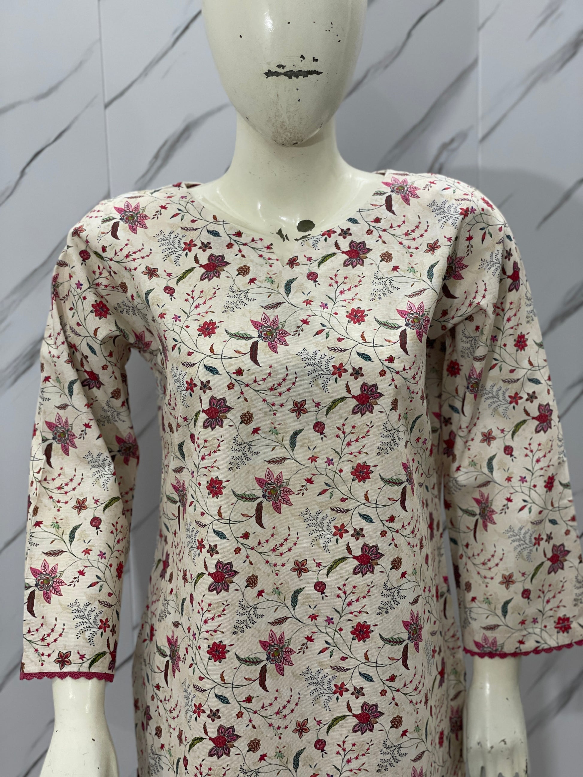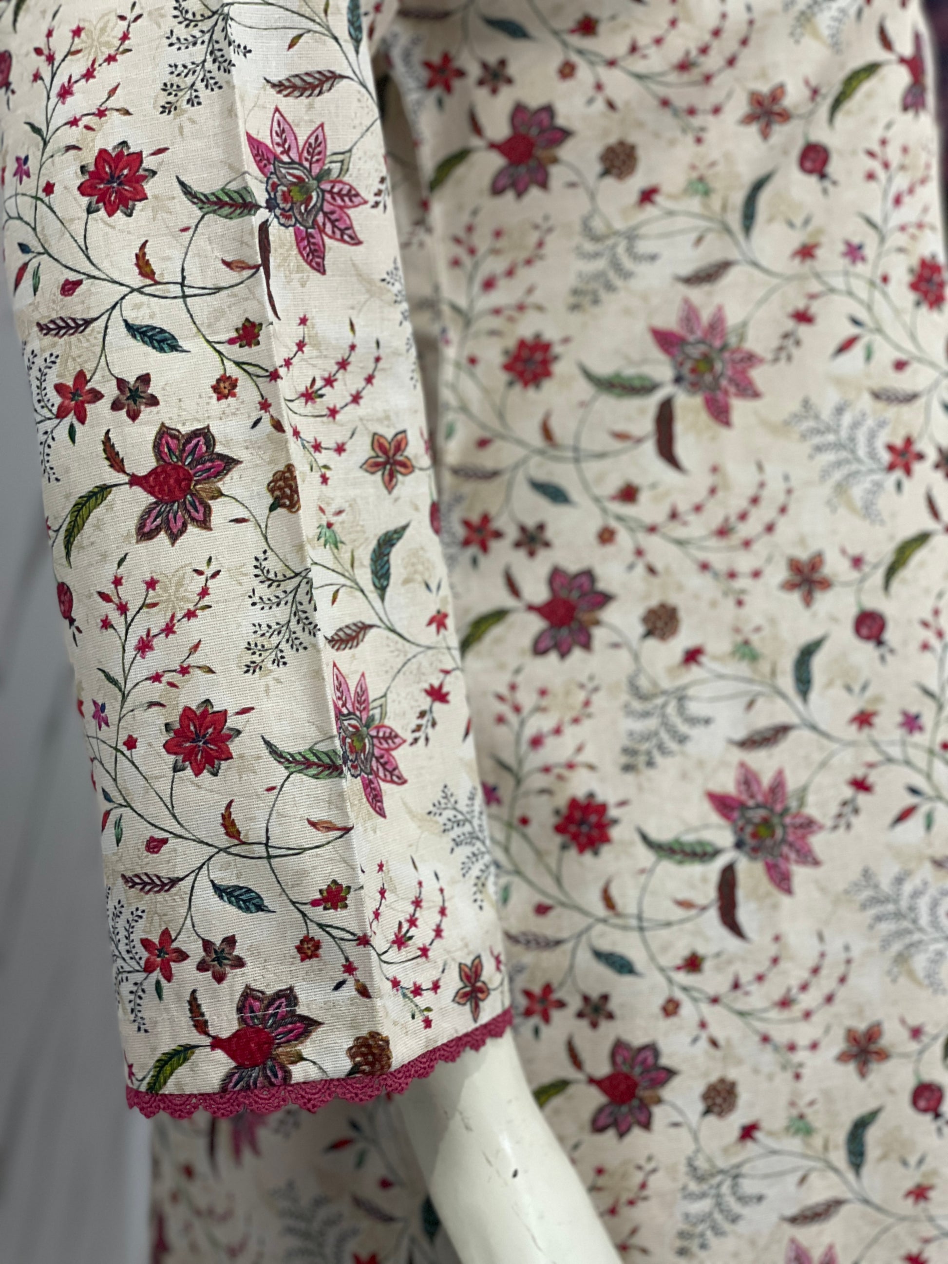 Delicate and timeless, this white and pink floral Kameez Shalwar offers a perfect blend of elegance and femininity. The soft floral pattern exudes charm, while the lace on the sleeves adds a sophisticated, refined touch. Ideal for both casual and festive occasions, this ensemble is designed to make you feel effortlessly beautiful.
