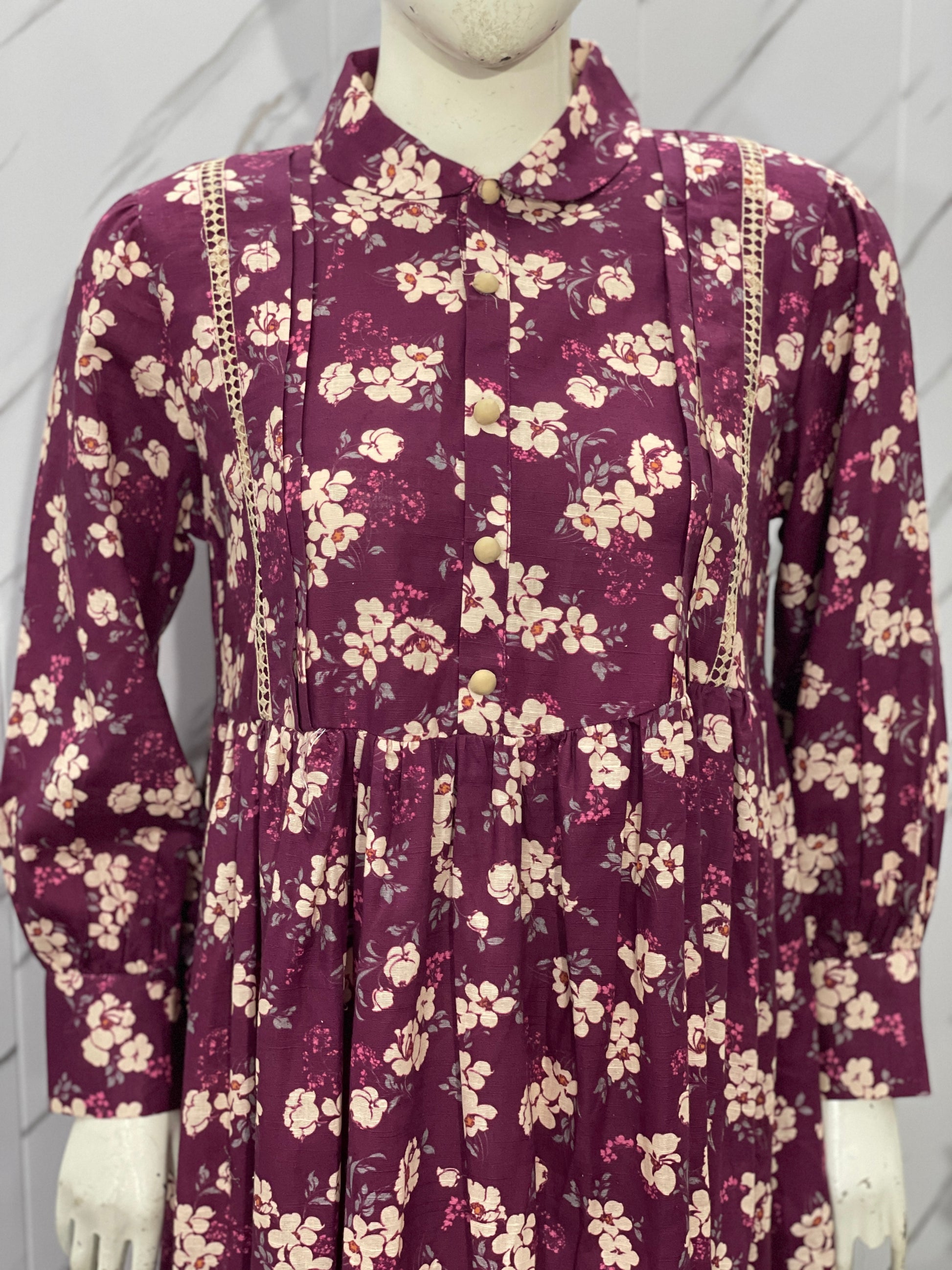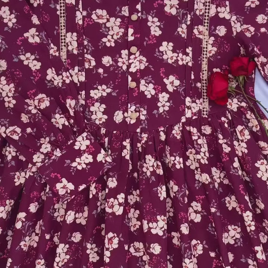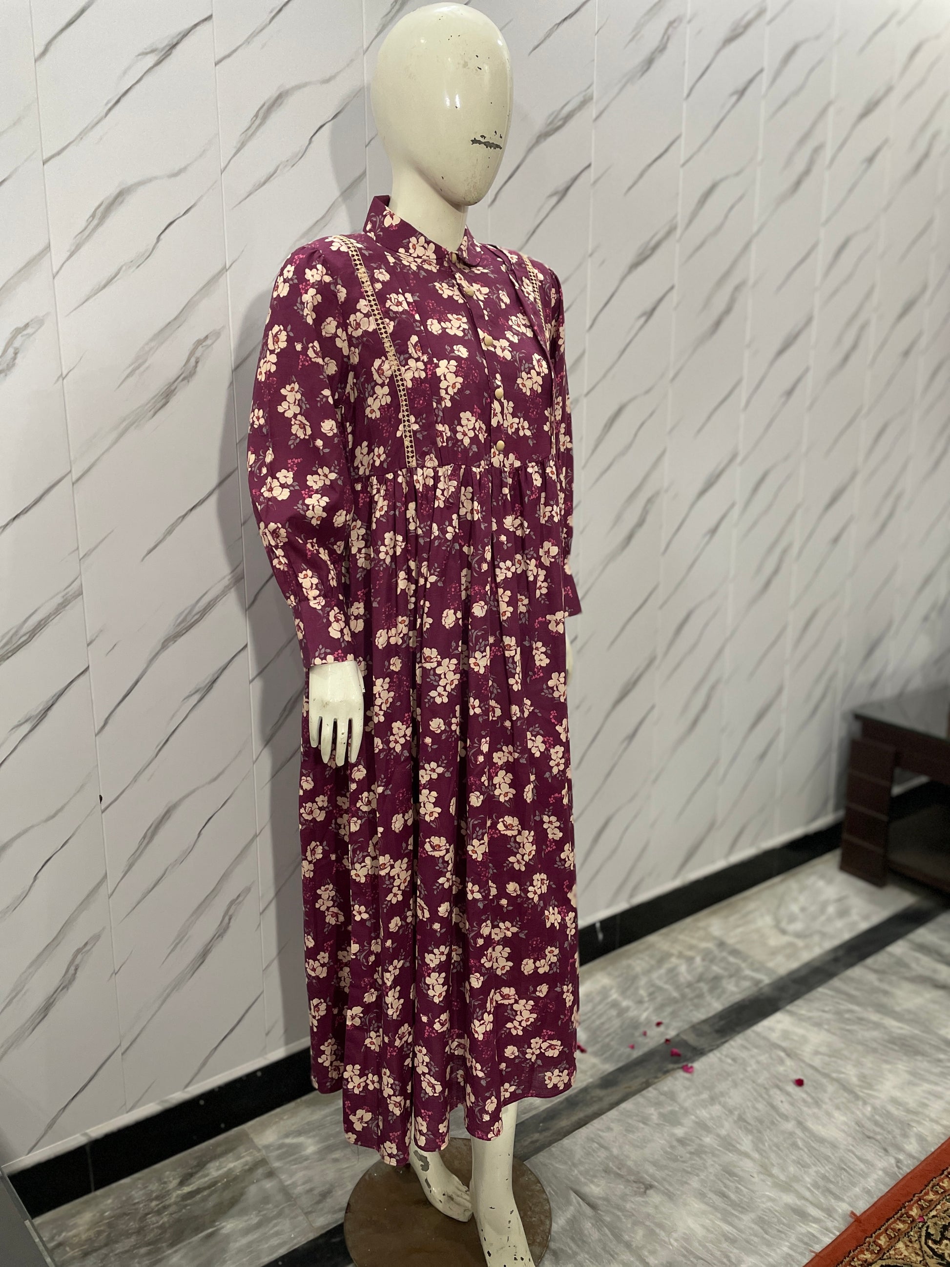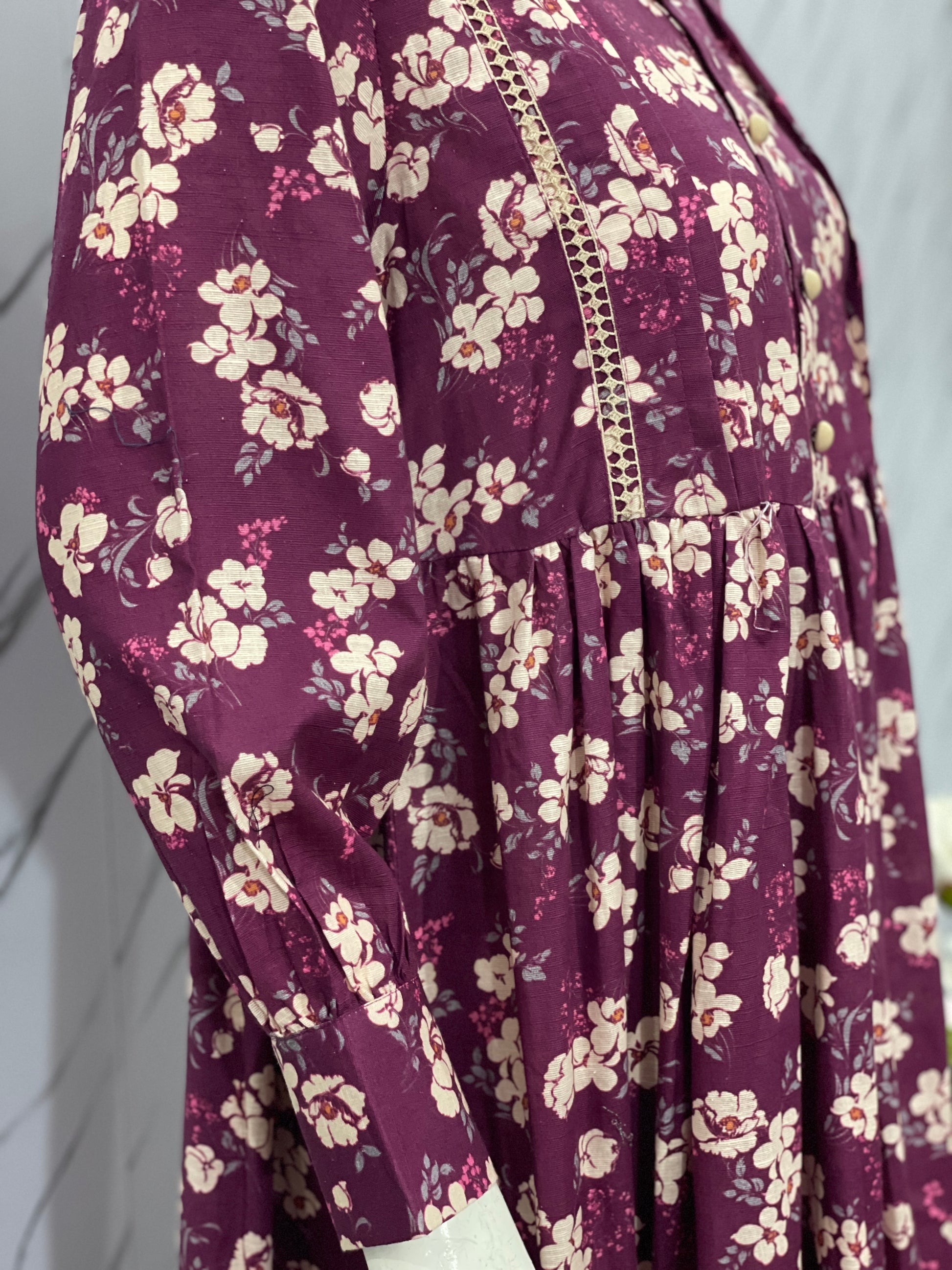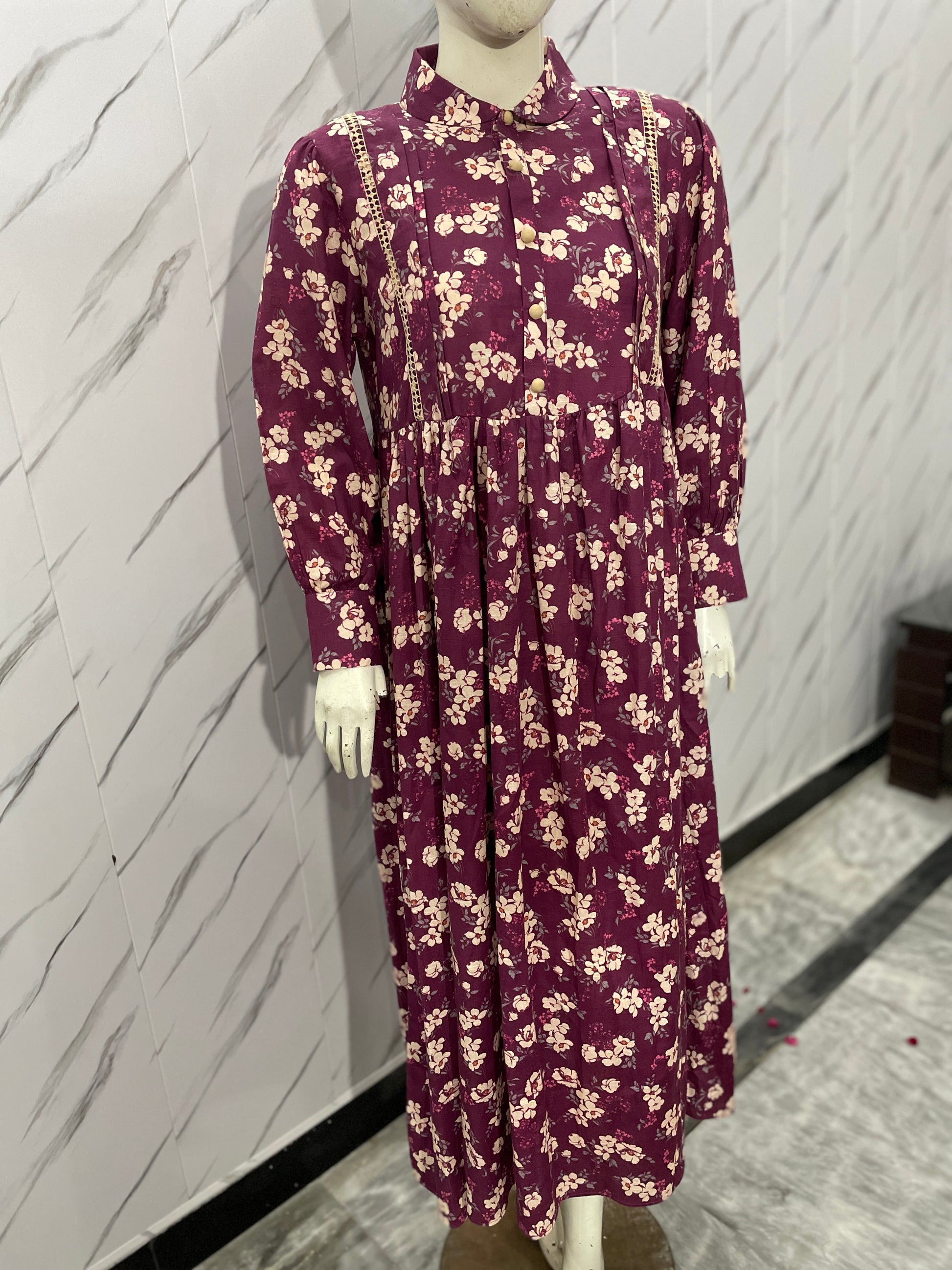 Step into timeless elegance with this stunning purple floral long frock. Featuring intricate lace and graceful pleats on the bodice, it exudes sophistication and charm. The cuffed sleeves with button detailing add a refined touch, making it a perfect choice for any special occasion or casual outing.