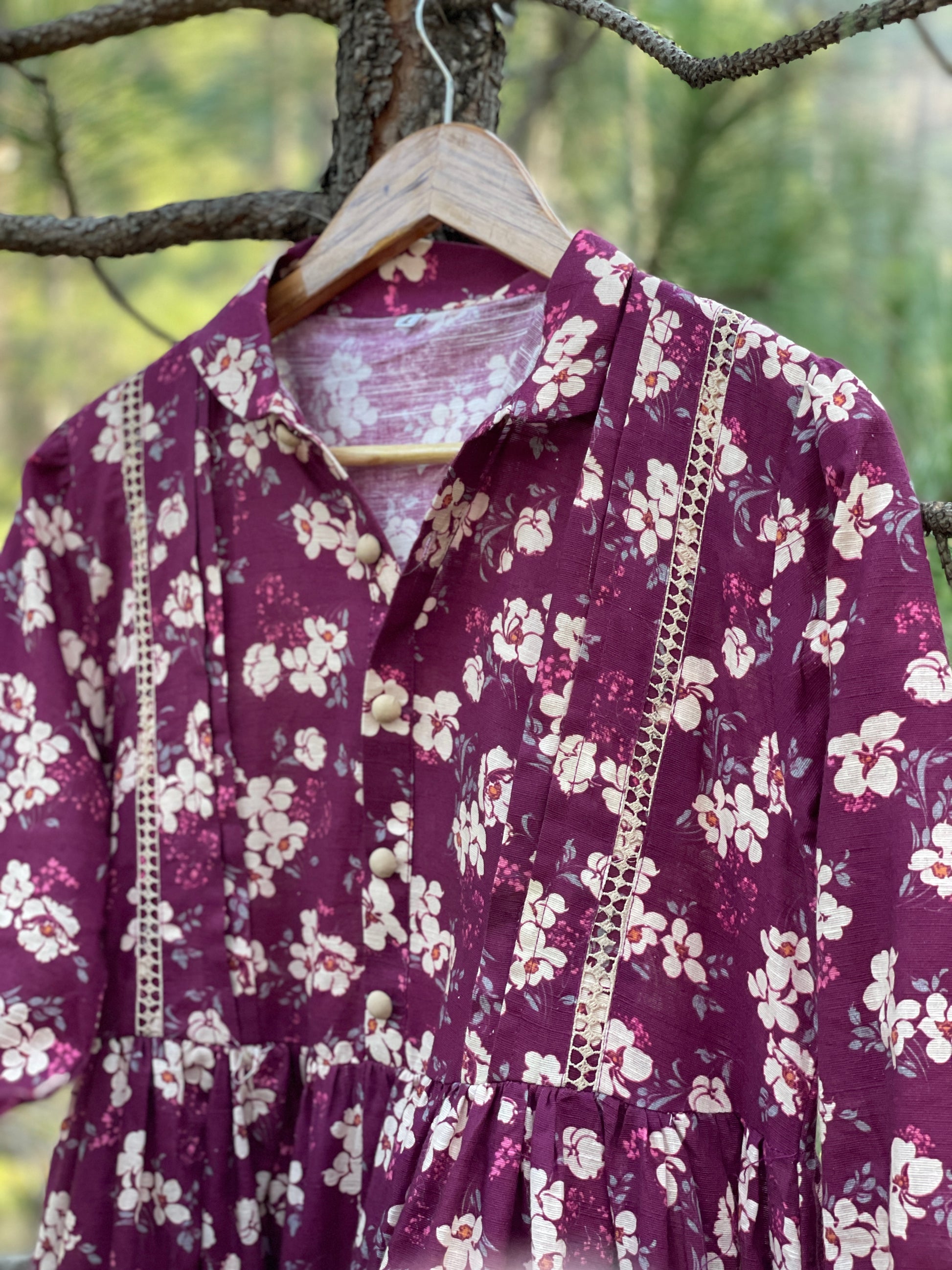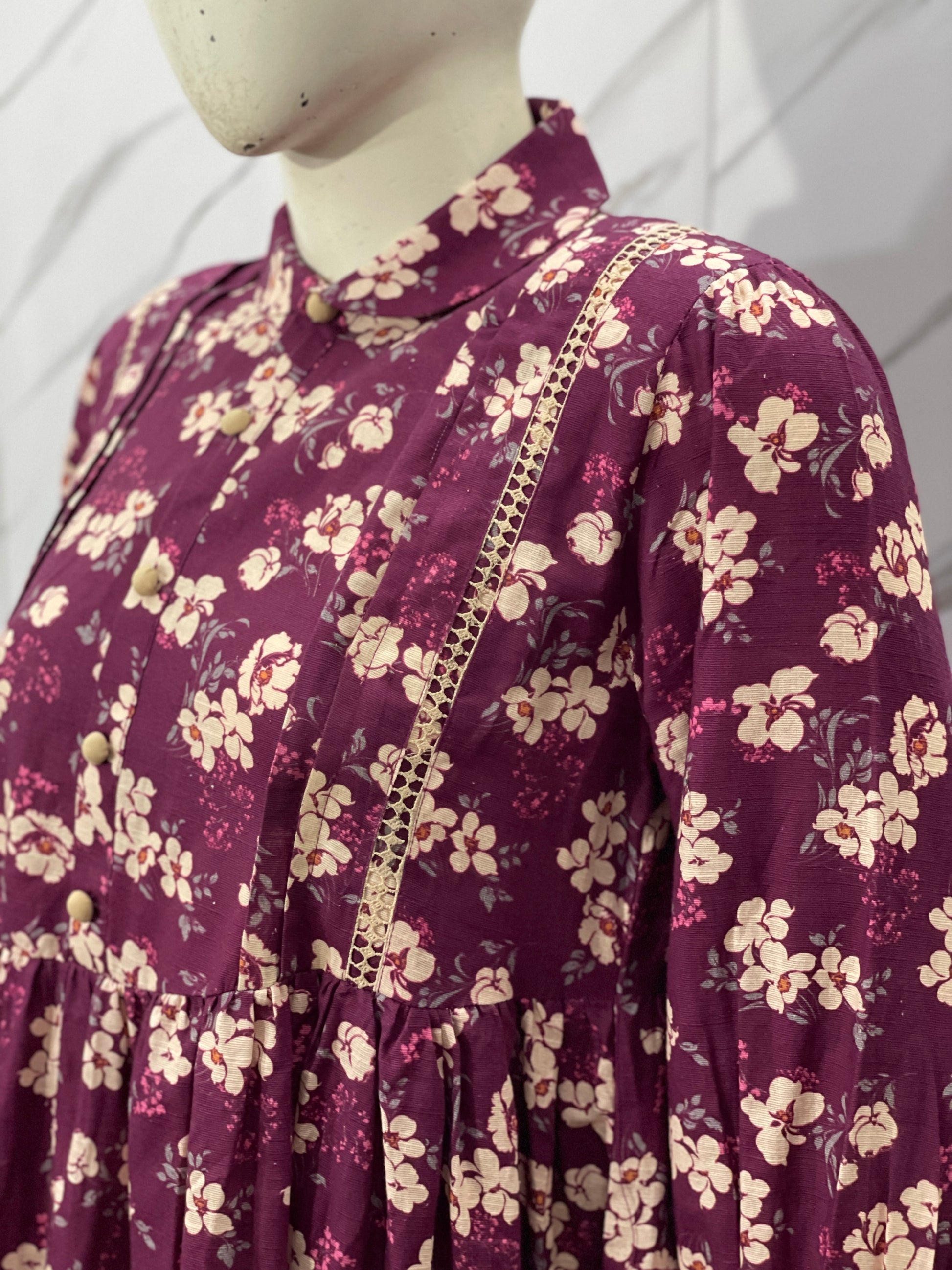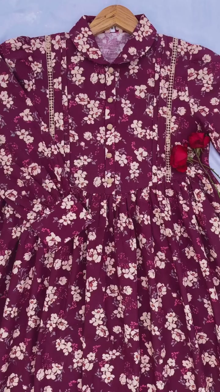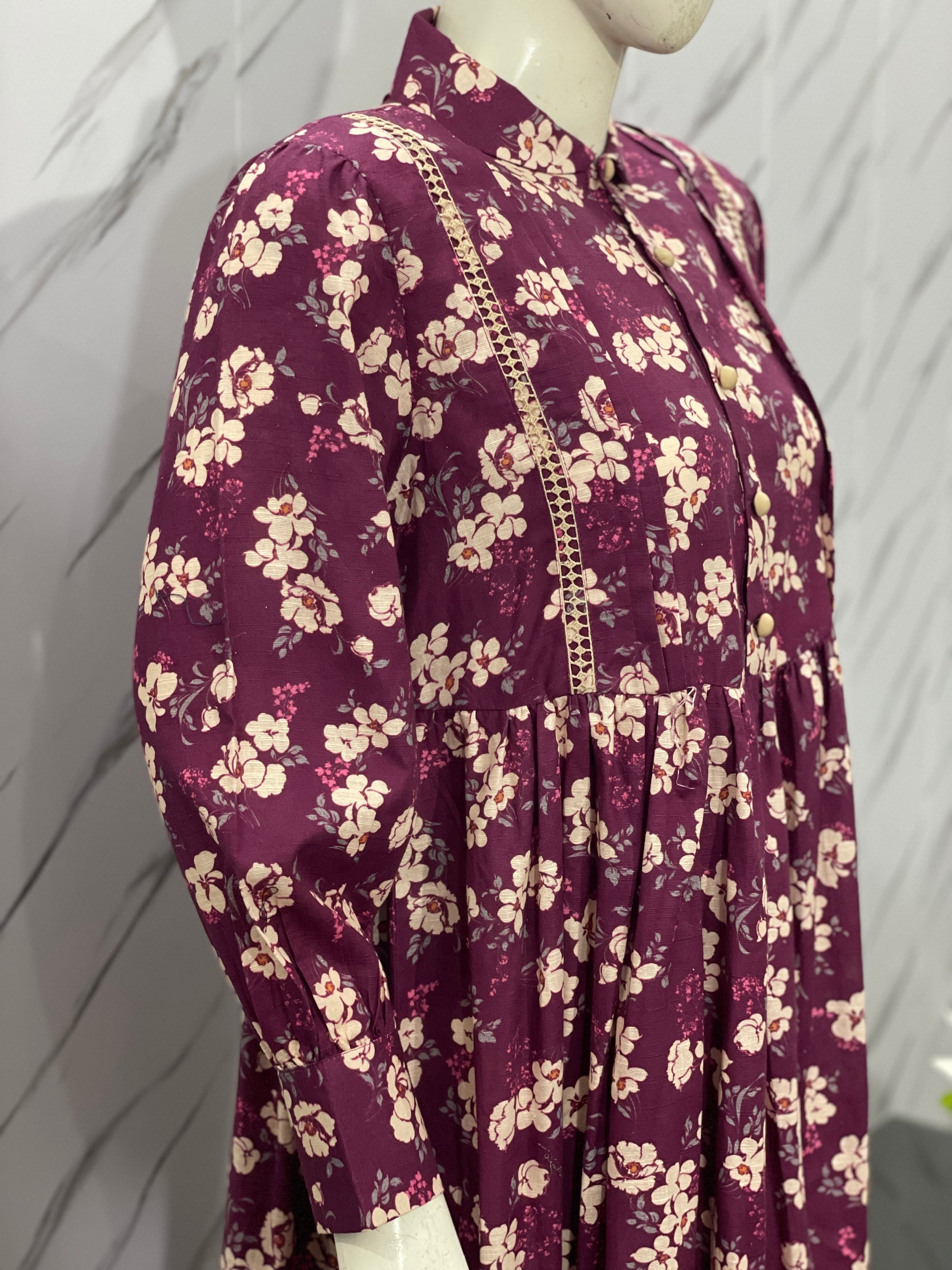 Step into timeless elegance with this stunning purple floral long frock. Featuring intricate lace and graceful pleats on the bodice, it exudes sophistication and charm. The cuffed sleeves with button detailing add a refined touch, making it a perfect choice for any special occasion or casual outing.