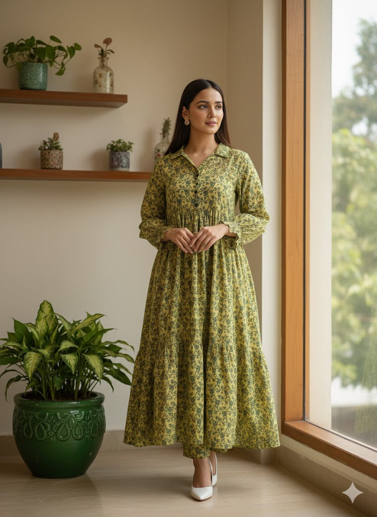 Elevate your style with this exquisite green frock, designed with a chic coat collar and adorned with elegant buttons. Made from premium Katrai Marina fabric, it offers unmatched comfort and sophistication. The elastic cuff sleeves add a touch of practicality while enhancing the frock’s refined silhouette. Perfect for formal events or casual outings, this piece is where classic meets contemporary.