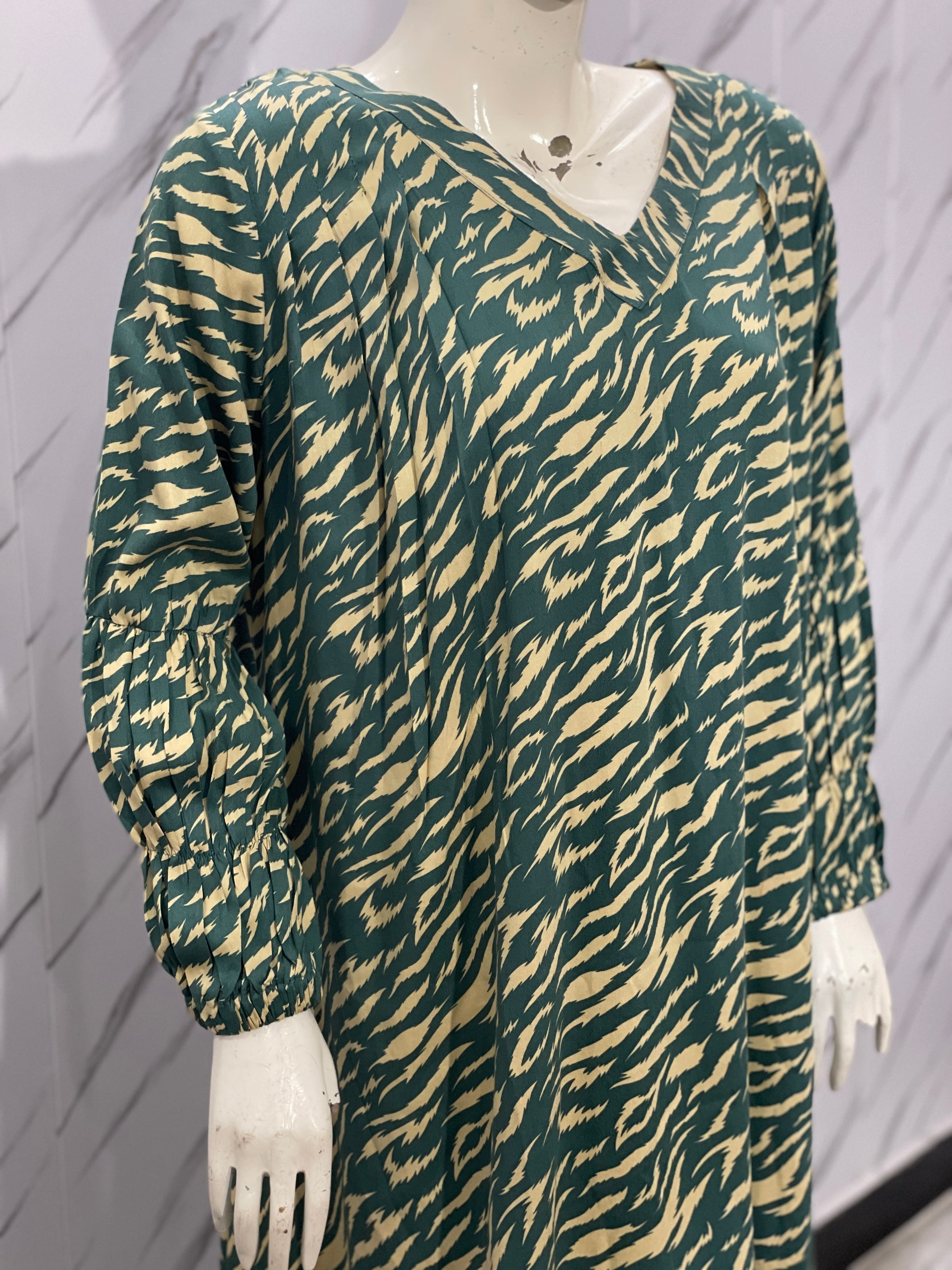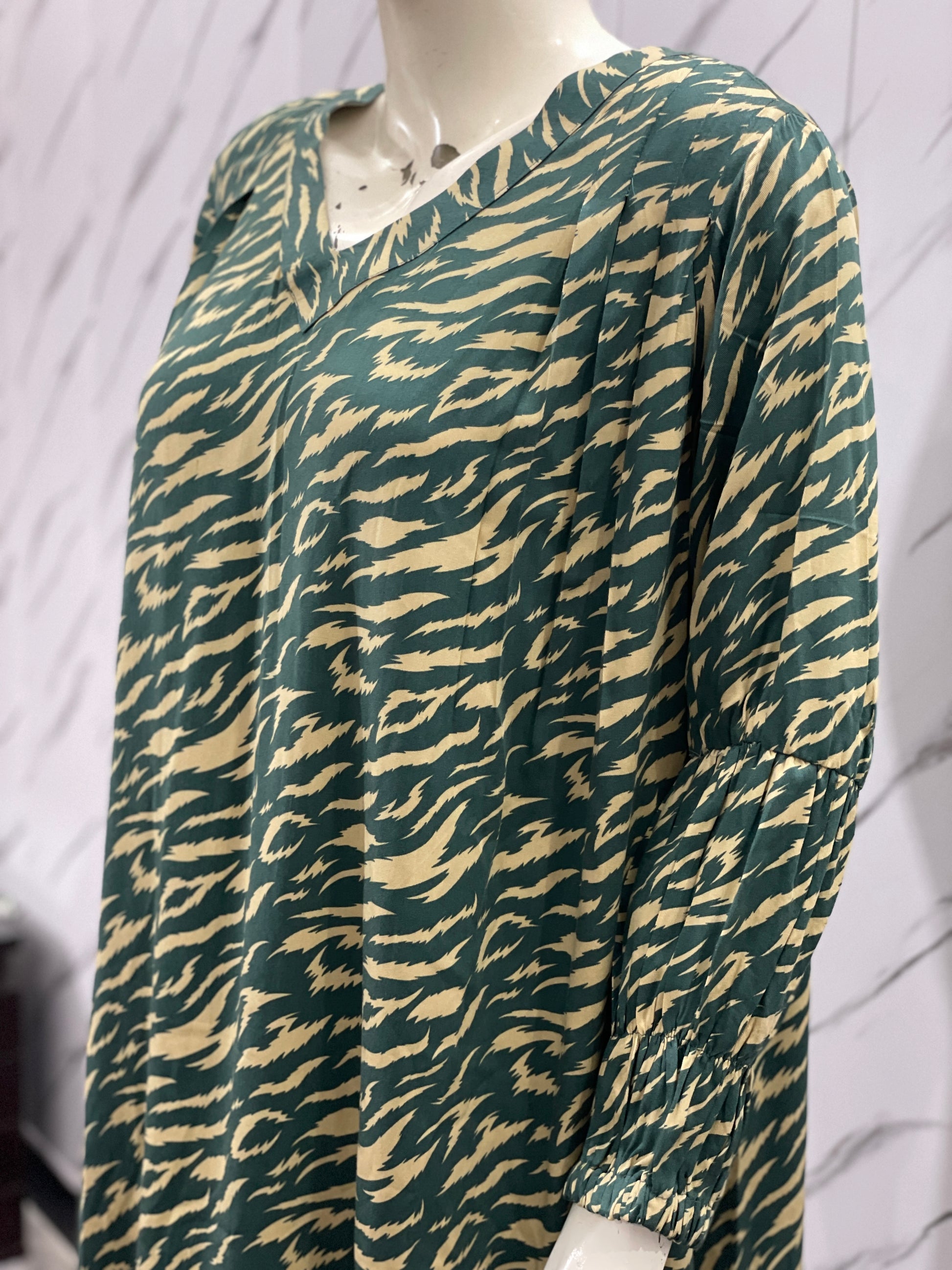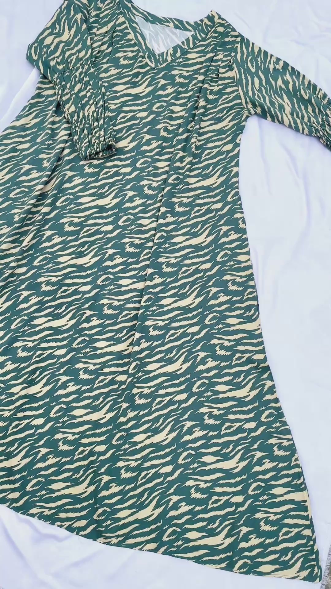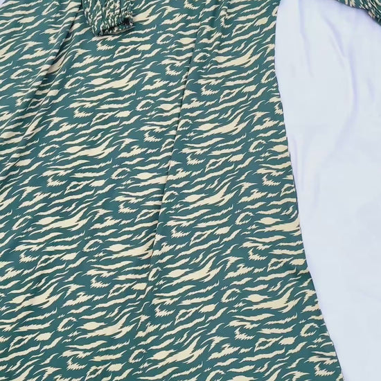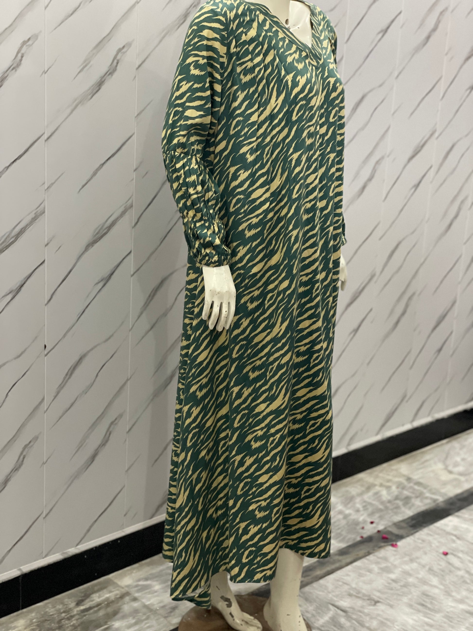 Make a bold statement with this green and skin cheetah print long frock, tailored from premium Marina fabric. Designed with a stylish V-shaped neckline and elastic cuff sleeves, this frock exudes confidence and elegance. Perfect for both casual and formal settings, it’s where comfort meets chic fashion.