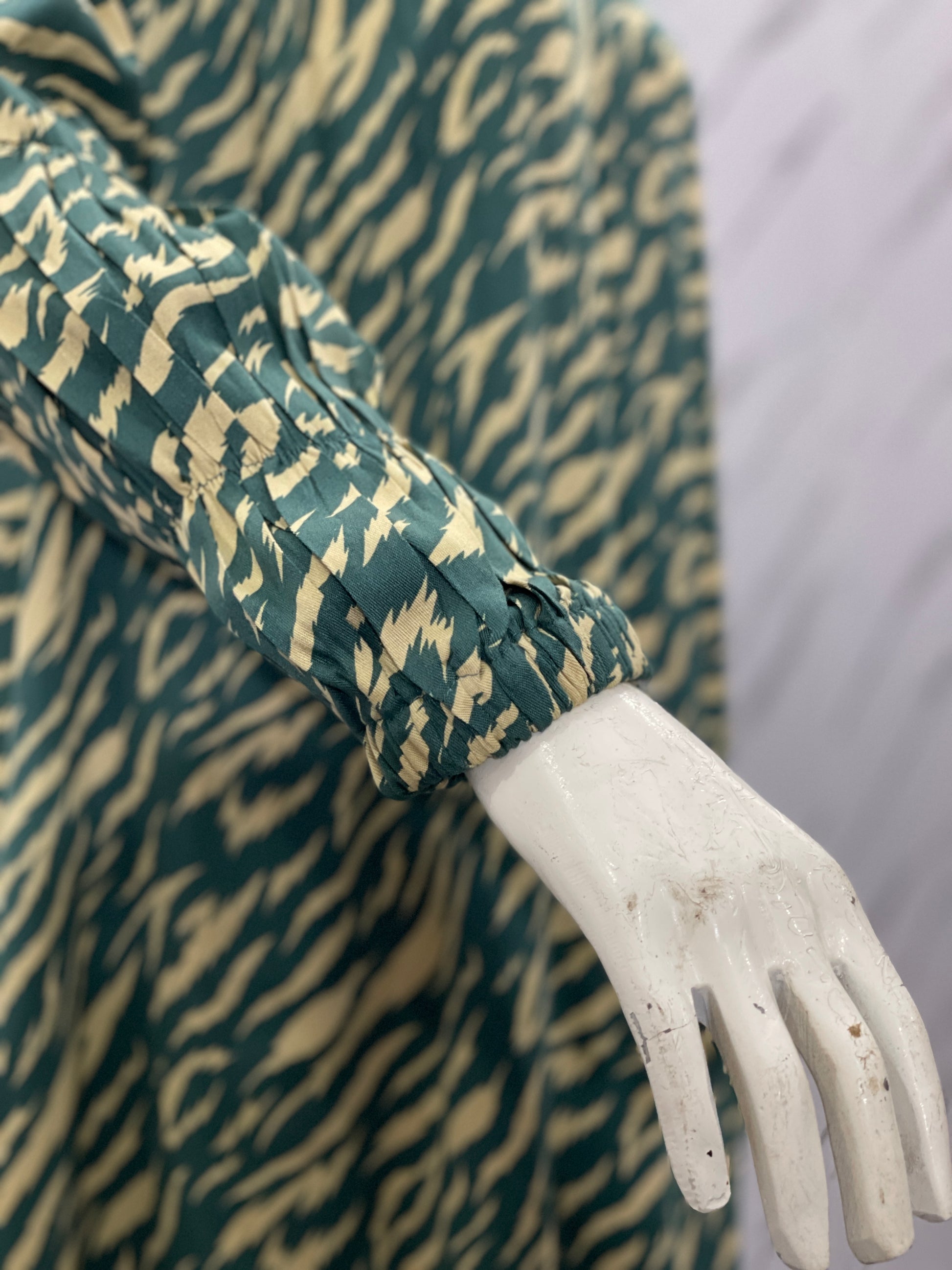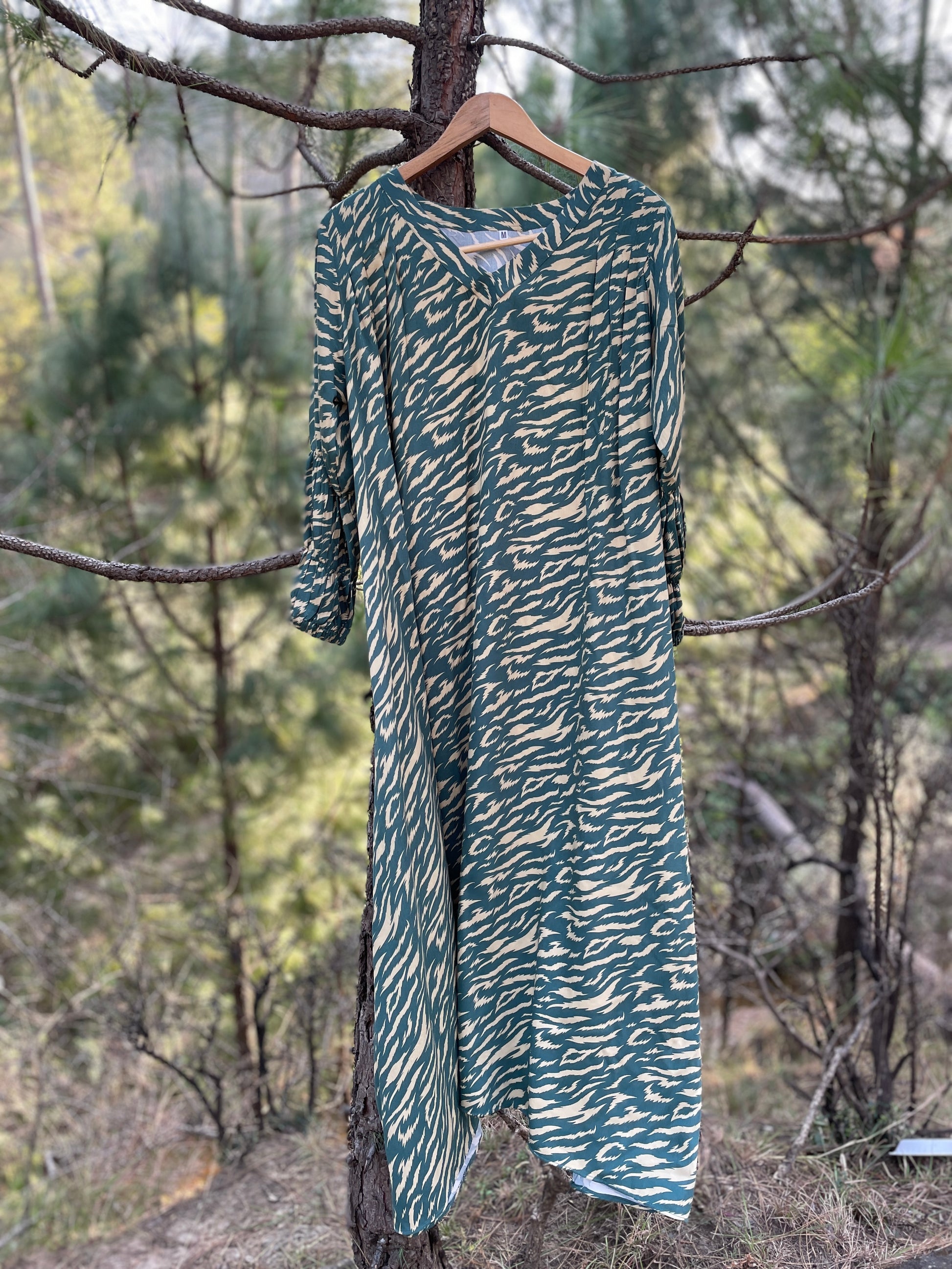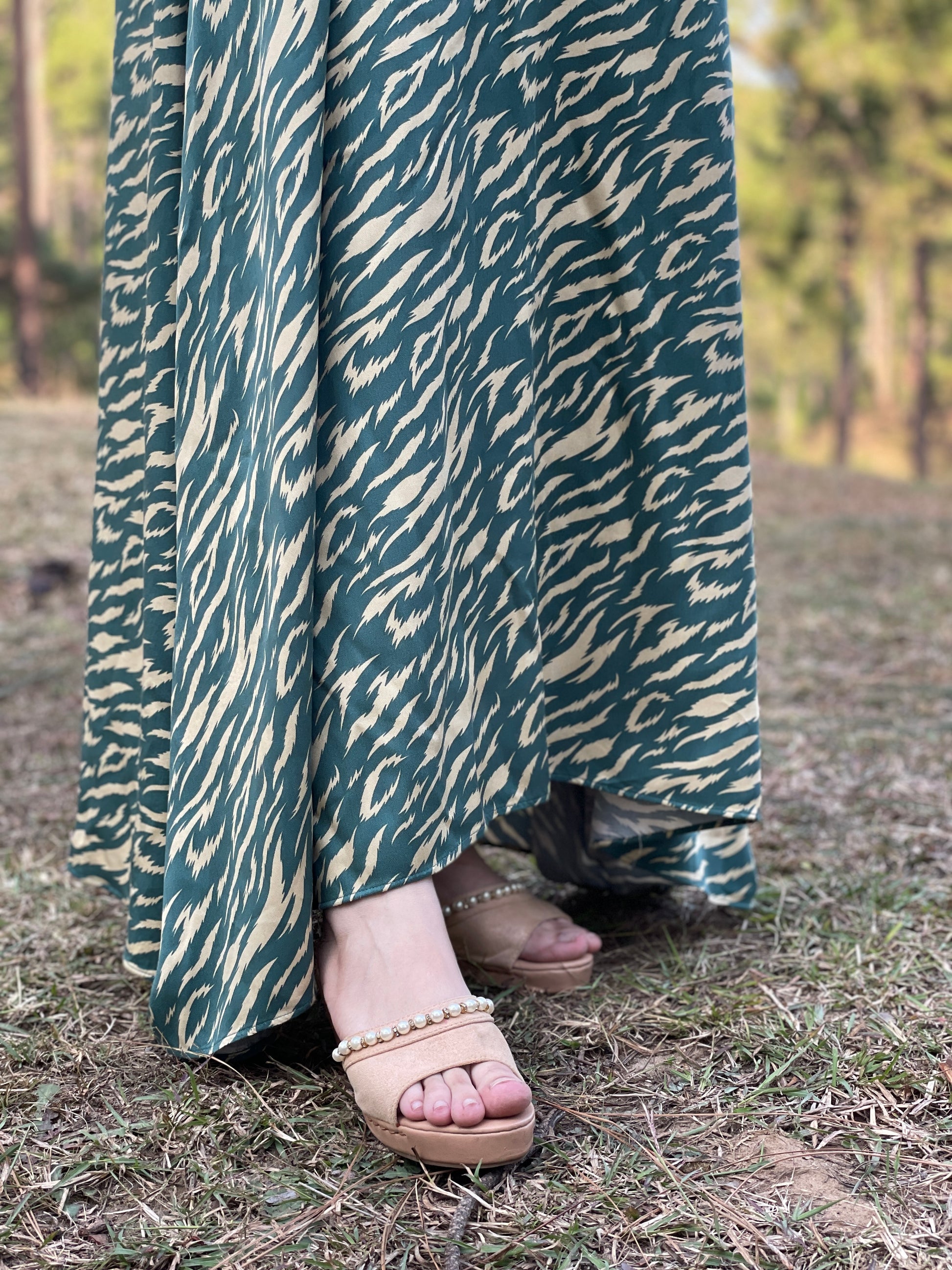 Green and Skin Cheetah Print Long Frock with Puff Sleeves